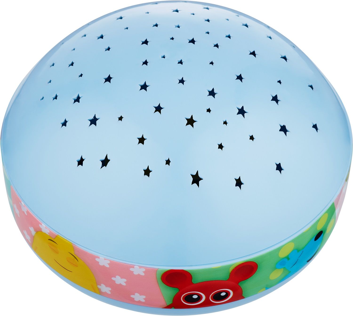 Sød natlampe med projektor, dekoreret med søvndyssende motiver. Lampen lyser væg og loft op med stjerner i forskellige farver. Lysstyrken kan justeres med en knap på undersiden, og lampen kan spille en sød vuggevise.