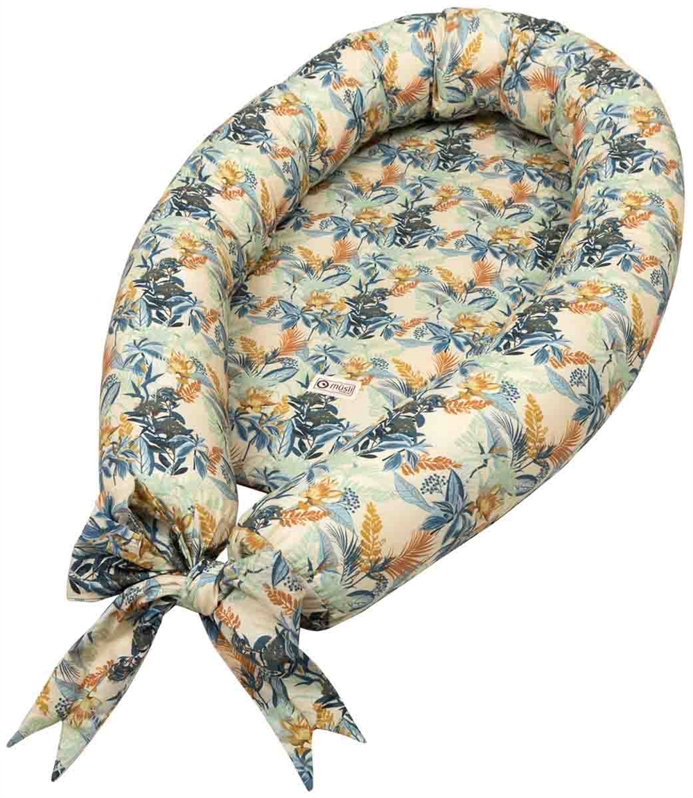 Behagelig og tryg babyredeDenne babynest fra Müsli er okkerfarvet med blomsterprint. En babynest er lavet til at tilbyde den mest behagelige og sikre søvn til et nyfødt barn. Den er blød nok til at være behagelig, men fast nok til at støtte dit barns ryg og nakke. Den hjælper også med at holde barnet på plads, hvilket forhindrer dem i at rulle rundt i søvnen. Den er lavet af 100% økologisk bomuld, hvilke er kendt for sin utrolige blødhed og holdbarhed. Det tilbyder en behagelig overflade for dit barn at sove på og er let at rengøre, hvilket er en nødvendighed med små børn. Bomulden er også åndbar, hvilket sikrer optimal temperaturkontrol. Økologisk bomuld er dyrket uden brug af skadelige kemikalier, hvilket gør det miljøvenligt og bæredygtigt. Økologisk bomuld er også blidere mod huden. Med sit bløde betræk og en komfortabel skummadras er denne babynest et ideelt valg til din babys første måneder.