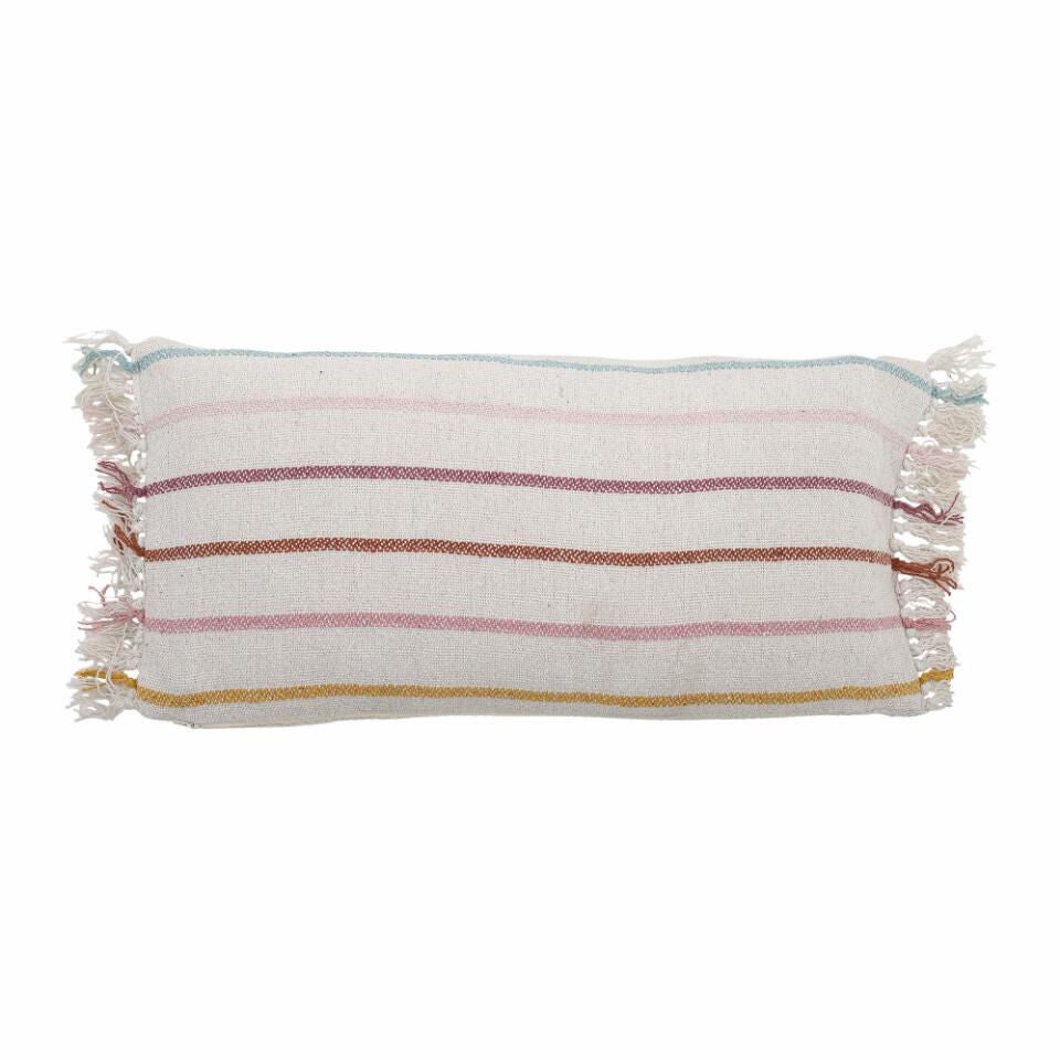 Tilføj et strejf af boheme-stil til dit børns værelse med denne skønne rektangulære pude. Med sit unikke design i vandrette, flerfarvede striber i nuancer som pastelhvid, lyserød, lilla, brun og gul, bliver puden et farverigt element, der skaber liv og personlighed i enhver indretning.