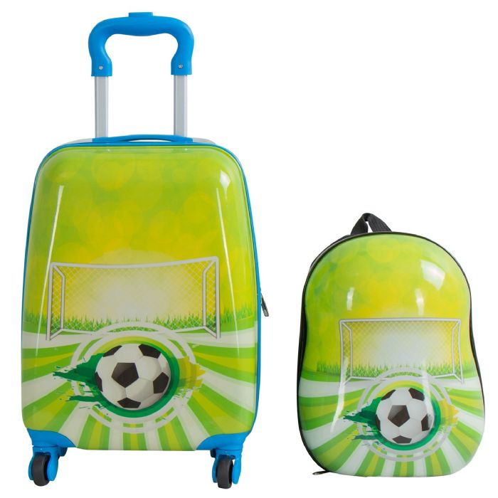 Rejsekuffert med rygsæk til børnDette er en lille og praktisk kabinekuffertset med en kuffert og en rygsæk i grøn med en fodbold. Sættet er perfekt til barnet, der ønsker en robust og slidstærk kuffert, der samtidig er let at manøvrere med og nem at opbevare, samt en tilhørende rygsæk. Kufferten er forsynet med et praktiske teleskophåndtag. Teleskophåndtaget kan indstilles i 2 positioner. Kufferten er ideel til både korte rejser og længere ferier, og med dens smarte opdeling kan man nemt kan organisere tøj og andre genstande. Det ene rum har justerbare krydsstropper, der holder tøjet på plads, mens det andet rum kan lukkes med lynlås for at forhindre løse genstande i at flytte sig rundt. Rygsækken har også to rum – et stort rum med et mindre rum indeni, smat justerbar skulderstropper.