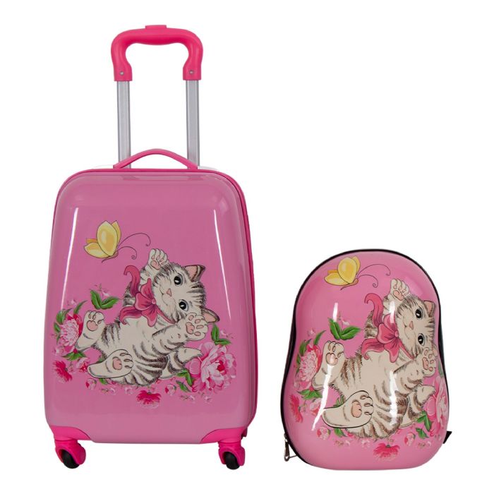 Rejsekuffert med rygsæk til børnDette er en lille og praktisk kabinekuffertset med en kuffert og en rygsæk i pink med en killing. Sættet er perfekt til barnet, der ønsker en robust og slidstærk kuffert, der samtidig er let at manøvrere med og nem at opbevare, samt en tilhørende rygsæk. Kufferten er forsynet med et praktiske teleskophåndtag. Teleskophåndtaget kan indstilles i 2 positioner. Kufferten er ideel til både korte rejser og længere ferier, og med dens smarte opdeling kan man nemt kan organisere tøj og andre genstande. Det ene rum har justerbare krydsstropper, der holder tøjet på plads, mens det andet rum kan lukkes med lynlås for at forhindre løse genstande i at flytte sig rundt. Rygsækken har også to rum – et stort rum med et mindre rum indeni, smat justerbar skulderstropper.