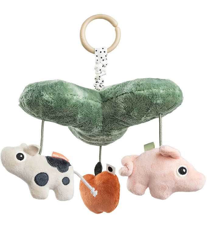 Oplev den fortryllende musikuro fra Done by Deer, der bringer Tiny Farm-universet til live med et charmerende farvemix. Med en blød og indbydende grøn top er uroen designet til at hænge sikkert i børneværelset. De tre delikate figurer, der svæver under toppen – en ko, et æble og en gris – skaber en beroligende atmosfære med deres harmoniske samspil af neutrale og pastelfarver. Denne musikuro er ikke blot en dekoration, men en invitation til ro og drømme, der vil glæde både børn og forældre.