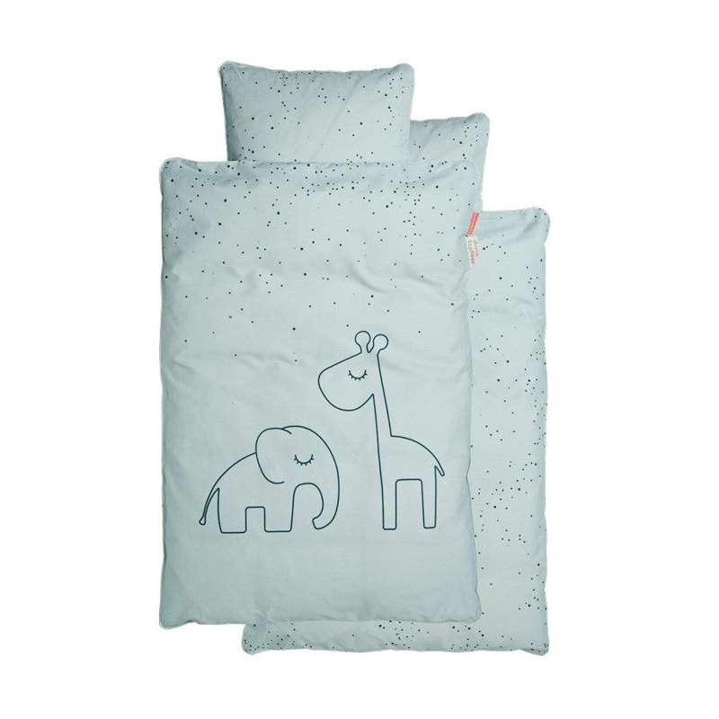 Dette lækre sengetøj til baby med Elphee og Raffi på den ene side og med prikker på den anden side.