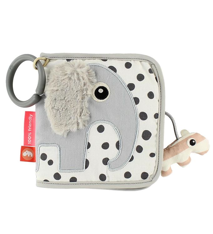 Oplev det magiske univers af Done By Deer med denne charmerende stofbog, der er lavet af blød bomuld. På forsiden møder du den søde elefant, Elphee, der prydes af fine prikker og har en lille fin stofhale eller vedhæng, som de små fingre kan udforske. Bogen er designet i beroligende nuancer, primært grå og beige, hvilket skaber en rolig atmosfære for den lille opdagelsesrejsende. En praktisk ring gør det nemt at fastgøre bogen til barnevognen eller autostolen, så dit barn altid har noget sjovt inden for rækkevidde. Med et venligt og blødt design er denne bog fra Done By Deer perfekt til at stimulere dit barns sanser og nysgerrighed.