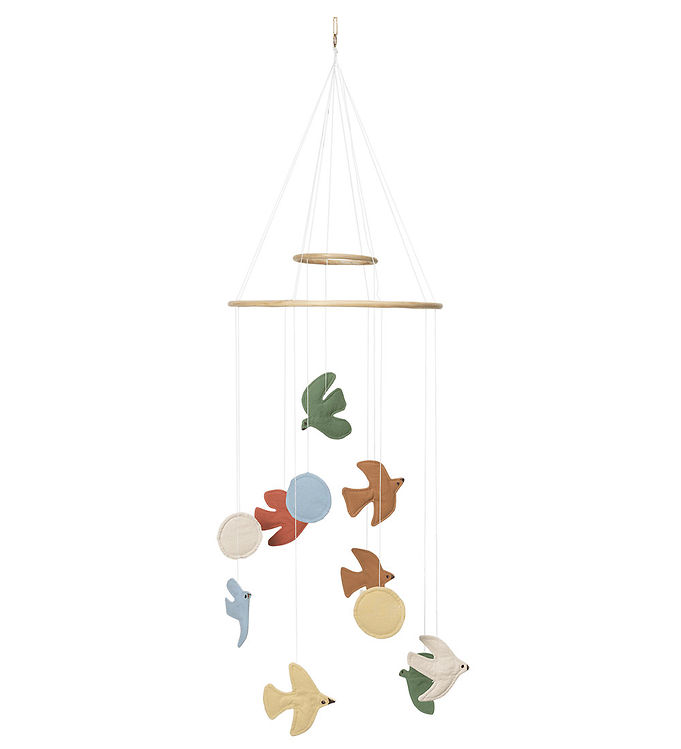 Skab et beroligende og stimulerende miljø i dit barns værelse med denne smukke uro fra Ferm Living. Designet til at hænge fra loftet, fanger den hurtigt opmærksomheden med sine bløde bevægelser og farverige figurer. Uroen prydes af forskelligartede former — søde fugle og bløde cirkler — der svæve i en harmonisk dans og skaber en atmosfære af ro.