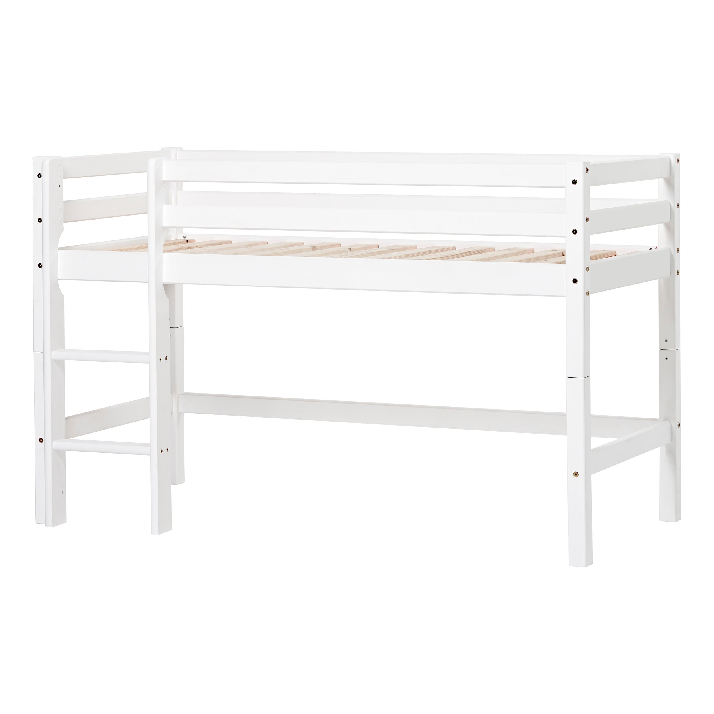 Giv dit barn en seng, der kombinerer stil, sikkerhed og bæredygtighed. Klik her for at sætte den hvide halvhøje seng i indkøbskurven og forvandle børneværelset i dag!