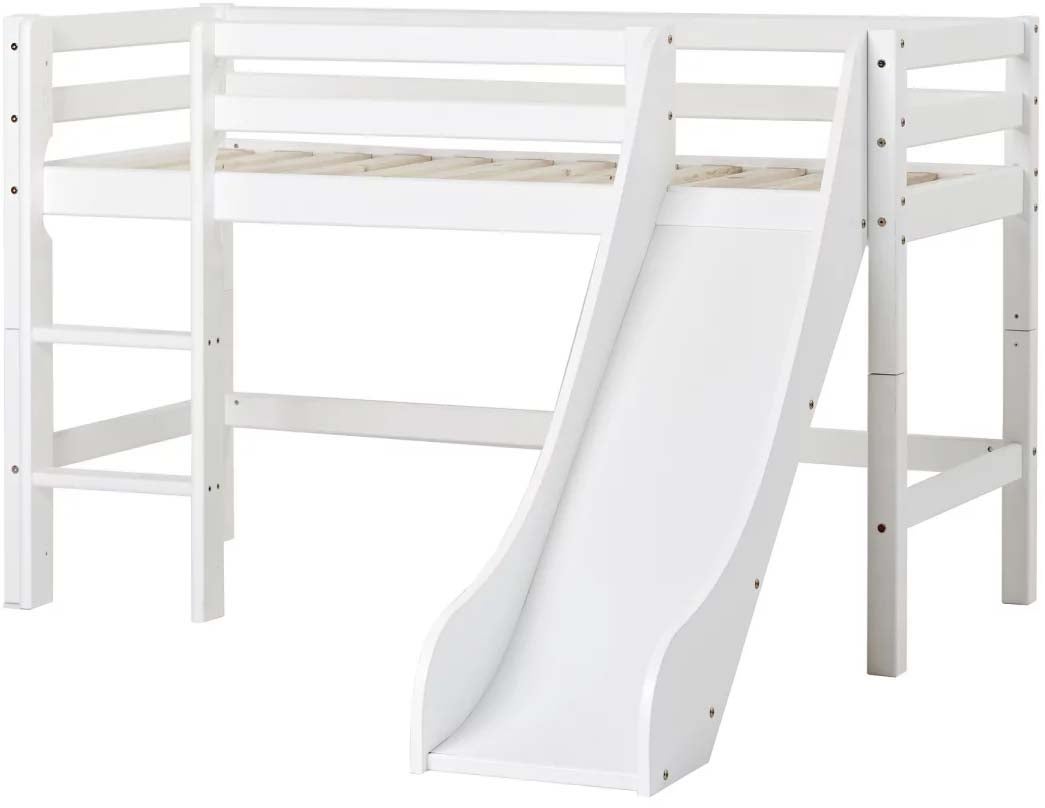 Med en højde på 69 cm under sengen får du ekstra gulvplads, der kan indrettes med kasser, hylder eller et hyggeligt tæppe til boglæsning. Den integrerede rutsjebane og den solide stige skaber daglig sjov og stimulering af barnets grovmotorik.