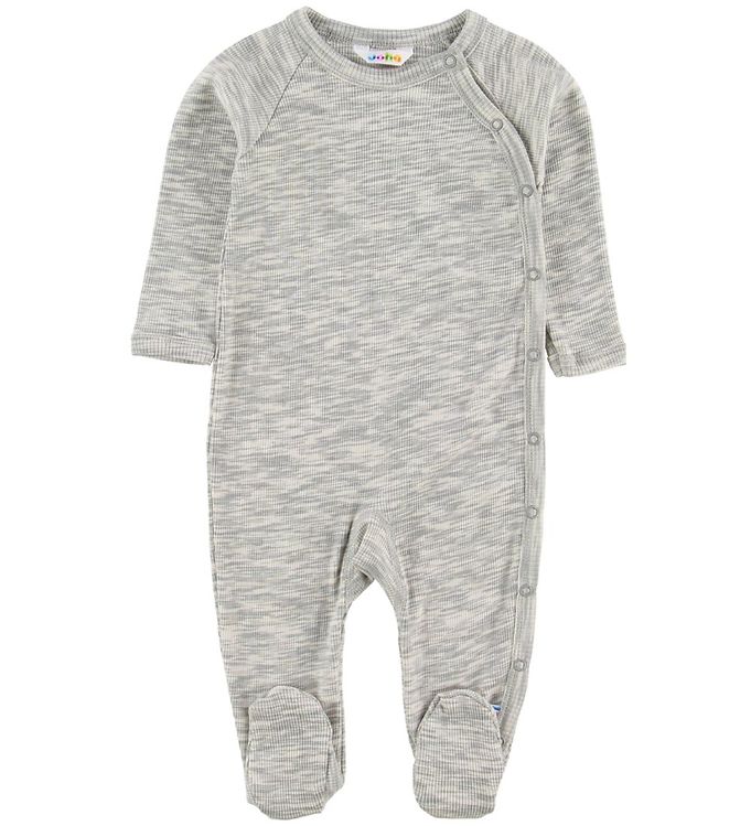 Når du leder efter den perfekte heldragt til din baby, er denne gråmelerede model fra Joha et fremragende valg. Designet omfavner både komfort og stil, med lange ærmer og fødder, der holder din lille varm i al slags vejr. Den praktiske knappelukning, der starter ved halsen og fortsætter ned langs siden til det ene ben, gør det nemt at skifte tøj, uden at gå på kompromis med bekvemmeligheden. Stoffets strikkede tekstur tilføjer et ekstra lag af blødhed og sikrer, at din baby altid er indhyllet i det bedste. Den lille etiket ved halsen vidner om det kvalitetsbevidste mærke, Joha, som står bag denne skønne dragt. Perfekt til både hverdagens små eventyr og de rolige stunder derhjemme.