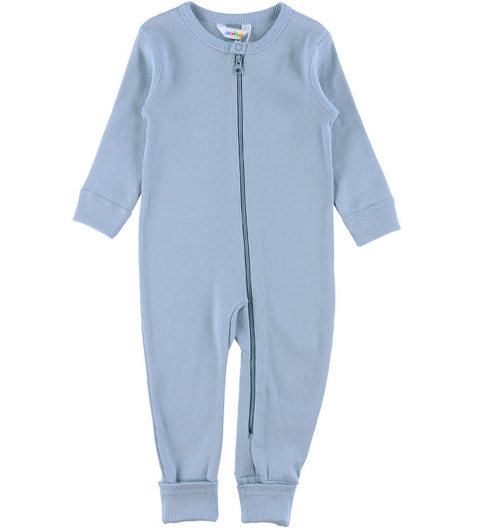 Forkæl din lille én med denne charmerende heldragt i den smukkeste støvede blå. Dragten er designet med fødder, som holder små tæer varme og komfortable hele dagen. De lange ærmer og manchetterne ved håndleddene sikrer, at dragten sidder godt på plads, mens den praktiske lynlås foran gør det nemt at klæde dit barn på. Lavet af et blødt ribmateriale fra det populære mærke Joha, er denne dragt både stilfuld og funktionel – perfekt til både søvn og leg.