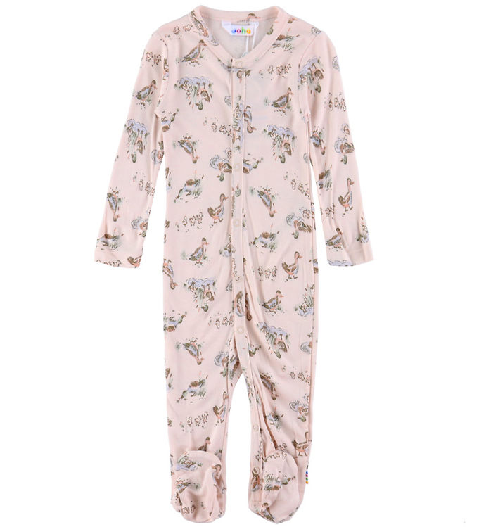 Oplev den sødeste heldragt til din lille guldklump, der kombinerer stil og komfort på en helt særlig måde. Denne lyserøde dragt med et charmerende andemønster er ikke bare en fryd for øjet, men også en drøm at have på. Designet er fremstillet af en blød blanding af viskose og bambus, som sikrer, at din baby føler sig godt tilpas dagen lang. De lange ærmer og de praktiske fødder holder den lille varm, mens den smarte lukning i midten gør det let at tage dragten af og på. Med Joha som brand kan du være sikker på, at dragten er skabt med kærlighed og omhu for dit barns komfort og velvære.