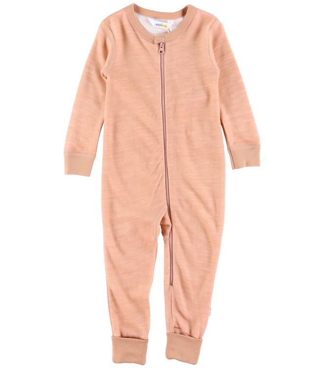 Oplev ultimativ komfort til din lille med denne charmerende heldragt i en blid ferskenfarve fra Joha. Den er fremstillet i en skøn kombination af uld og bambus, som sikrer både temperaturregulering og blødhed mod barnets hud. Den praktiske lynlås går fra halsen ned til det ene ben, hvilket gør påklædning og bleskift til en leg. Med ribkanter ved både håndled og ankler bliver dragten, hvor den skal, mens dit barn leger og sover. Dette er en ideel heldragt til de køligere måneder, der forener funktionalitet med en elegant stil.