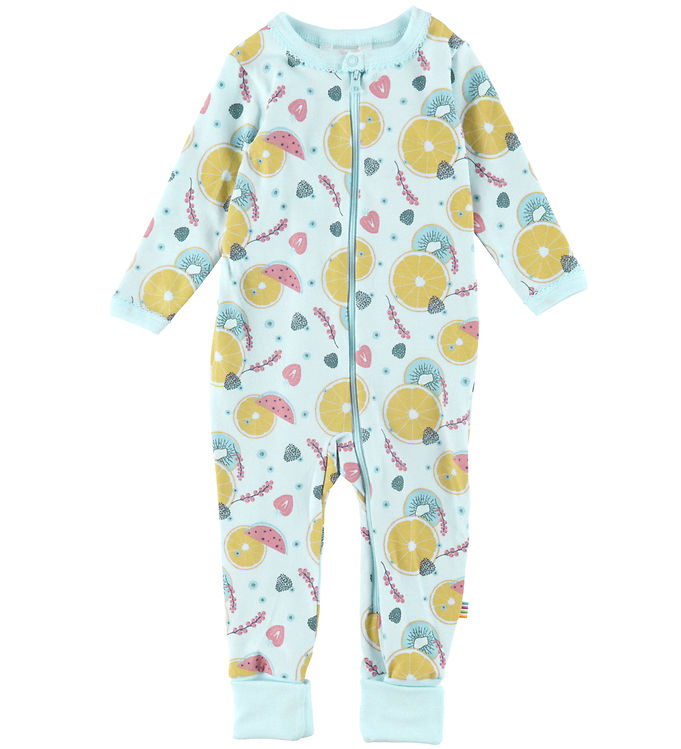 Opdag komfort og stil til dit barn med denne vidunderlige lyseblå natdragt fra Joha. Med sine lange ærmer og et charmerende mønster bestående af frugt i skønne gule, lyserøde og blå nuancer, er denne dragt både sjov og funktionel. Den praktiske lynlås foran gør det nemt at klæde barnet på, selv når det er tid til at sove. Perfekt til at holde dit barn hyggeligt indhyllet i komfort hele natten.