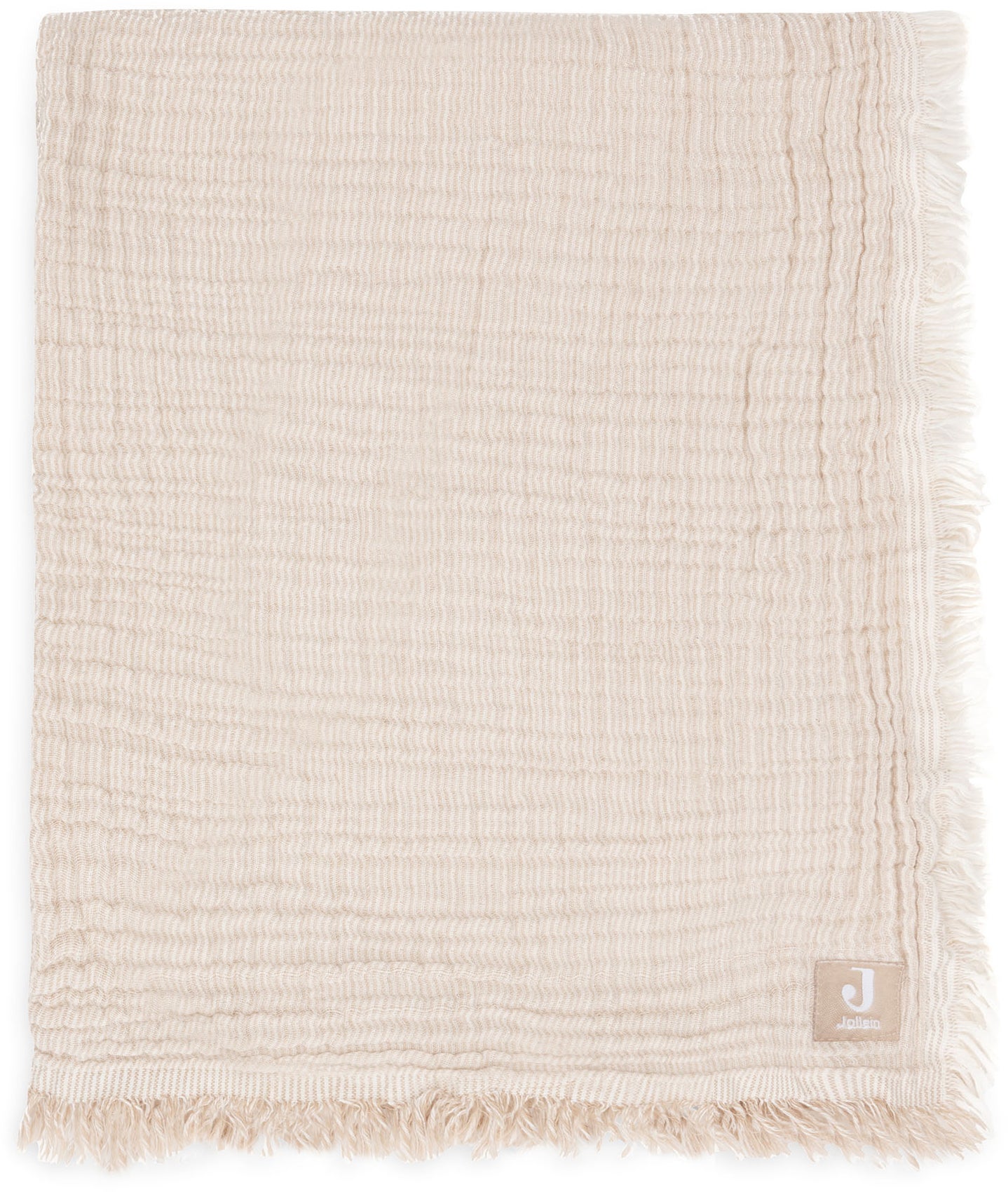 Opdag det perfekte tæppe til dit barn med dette stilfulde og komfortable design i en lys beige farve. Tæppet er fremstillet i blødt crepevævet musselin, der tilføjer en dejlig tekstur til enhver indretning. Den bølgede overflade giver ikke kun et unikt udseende, men tilføjer også et strejf af elegance. Tæppets kanter er dekoreret med fine frynser, som giver det et legende og moderne præg.