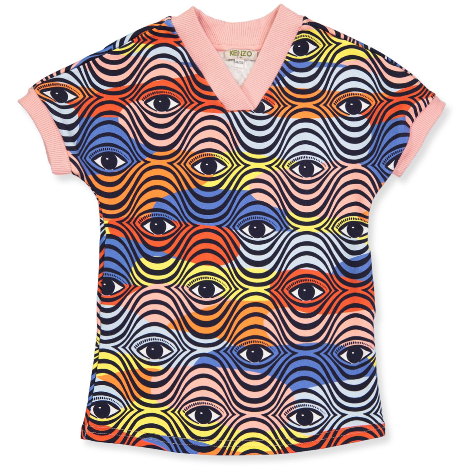Denne kjole fra Kenzo Kids er en sand fryd for øjet og perfekt til den modebevidste 10-årige. Kjolen kommer i flere farver og har et unikt mønster med gentagne øjenmotiver, der tilføjer et legende touch. Med en elegant V-formet halsudskæring og korte ærmer med lyserøde kanter, er den både stilfuld og komfortabel. De levende farver som blå, orange, gul og lyserød skaber et dynamisk udtryk, der med garanti vil vække opsigt. Ideel til både specielle lejligheder og hverdagsbrug, vil denne kjole uden tvivl blive en favorit i garderoben.