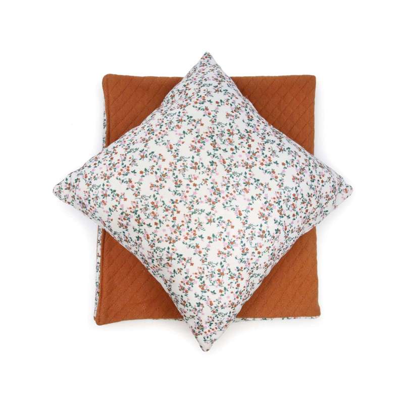 En lille, blomstrede pude og et vendbart tæppe i blødt jersey sørger for, at din datters dukker altid ligger varmt og trygt. Den ene side prydes af fine blomster, mens den anden i ensfarvet quilt giver et roligt look.