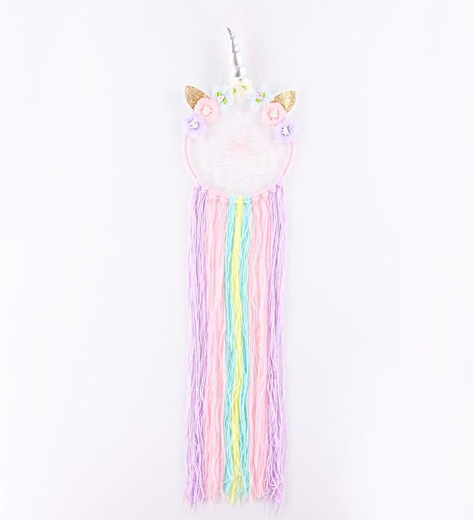 Forvandl børneværelset til en magisk oase med denne charmerende drømmefanger fra MillaVanilla, som har et fortryllende enhjørningedesign. Øverst på drømmefangeren findes et enhjørningehorn omgivet af smukke blomster og to delikate ører, der tilsammen skaber et eventyrligt udtryk. Midten er et net i pastelfarver, som udstråler en fredfyldt harmoni. Fra drømmefangerens bund hænger garntråde, der i farver som lilla, pink, blå og gul, bringer liv og farver ind i børneværelset. Denne skønne drømmefanger, med sin lysende confetti-æstetik, er både et dekorativt element og en beroligende tilføjelse til dit barns trygge omgivelser. Lad barnets drømme blive indhyllet i farverig magi og eventyr hver nat.