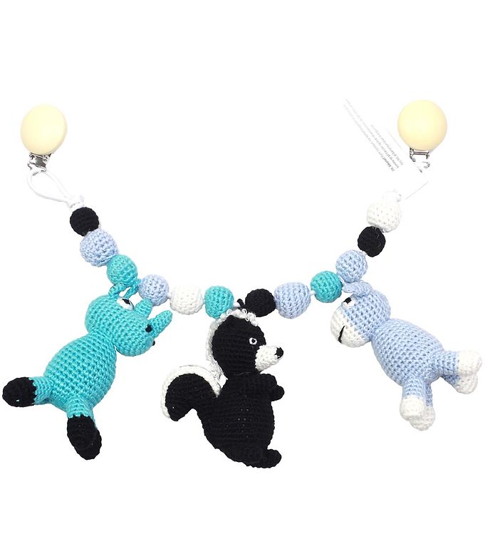 Oplev magien ved NatureZoos charmerende barnevognskæde, der bringer et strejf af eventyr til hver gåtur. Denne kæde præsenterer tre unikke hæklede figurer – et betagende næsehorn i turkis, et legesygt stinkdyr i klassisk sort og hvidt, samt et venligt æsel i en sart lyseblå nuance. Kæden emmer af farveglæde med sine kugler i harmoniske nuancer af turkis, blå, hvid og sort, som tilsammen skaber en visuel symfoni for både forældre og barn at nyde. Praktiske clips i hver ende sikrer en nem og sikker fastgørelse til barnevognen, så du kan fokusere på den hyggelige tid med din lille. Med NatureZoo får du ikke blot et produkt, men en oplevelse, der stimulerer barnets fantasi og sanser på en tryg og stilfuld måde.