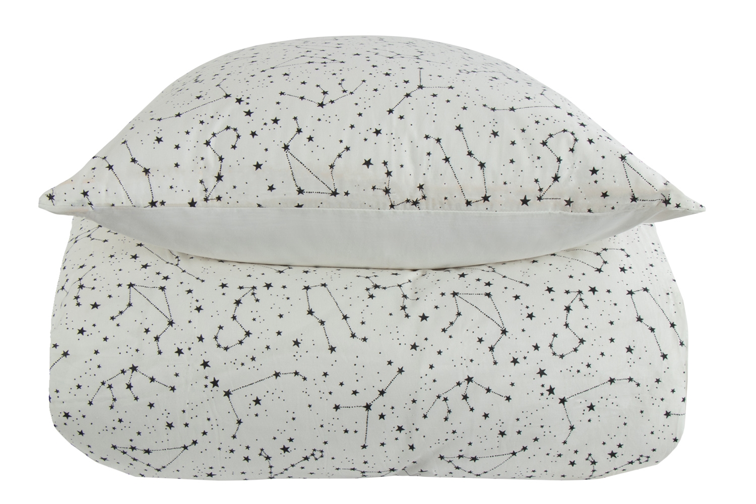 Oplev den ultimative komfort med Borg Livings dobbeltdynebetræk i Zodiac white design, der bringer nattehimlen ind i dit soveværelse. Dette sengesæt, fremstillet af 100% bomuld, er kendetegnet ved et tæt vævet garn med en thread count på 170, som sikrer både blødhed og holdbarhed. Det stilfulde hvide design prydes af sorte stjernebilleder, der skaber en rolig atmosfære til din nattesøvn.