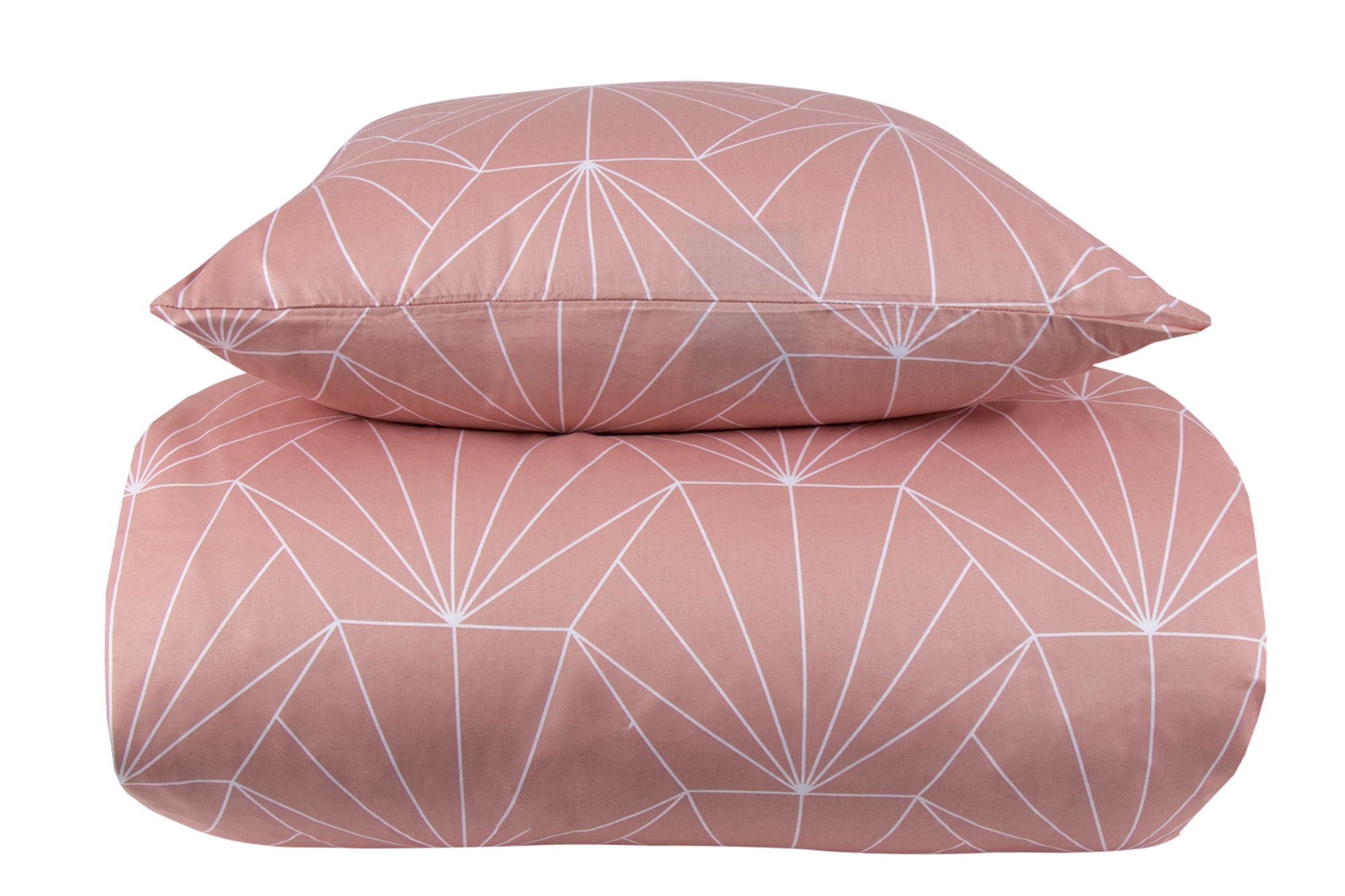 Dette vendbare design præsenterer en stilfuld ferskenfarvet hexagon på den ene side og et grafisk mønster på den anden, hvilket gør det nemt at forny din soveværelsesindretning ved bare at vende sengetøjet. Begge sider er gennemfarvede, hvilket sikrer en høj farve- og vaskeægthed, så det holder sig smukt vask efter vask.