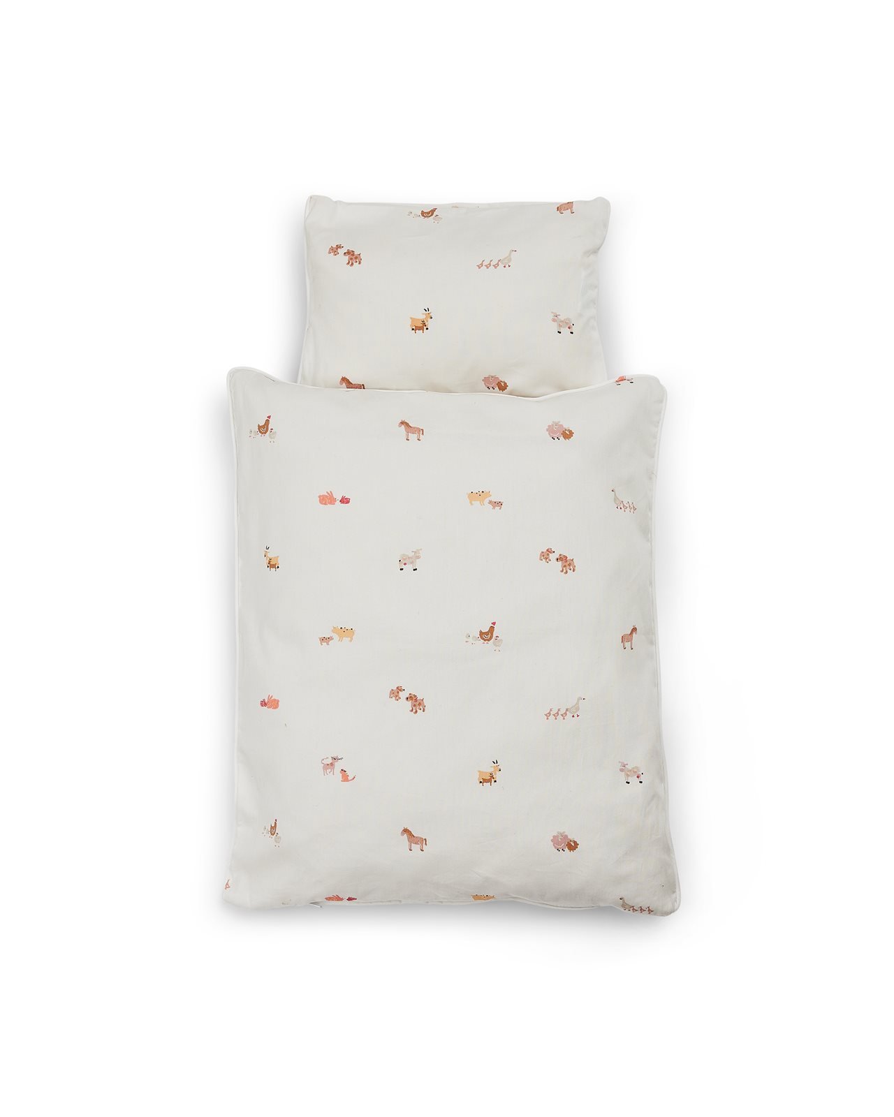 Giv dit barns dukker en hyggelig og komfortabel søvn med dette charmerende dukkesengetøj fra Smallstuff. Sættet består af en dyne og en pude, der begge er prydet med et yndigt mønster af små bondegårdsdyr, der danser omkring på en lys baggrund i delikat fersken. Disse bløde og indbydende tekstiler inviterer til timevis af fantasifuld leg, hvor dukkerne kan puttes godt og trygt. Med Smallstuff’s sans for detaljer og kvalitet er dette dukkesengetøj ikke blot en fornøjelse for øjet, men også en praktisk tilføjelse til ethvert børneværelse.