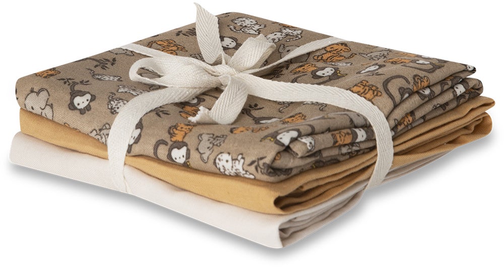 Oplev de skønne tekstilstykker fra That’s Mine, som tilføjer et touch af charme og funktionalitet til dit barns liv. Denne pakke indeholder tre bløde stykker stof, der er perfekte til både leg og dekoration. Det øverste stof præsenterer et festligt dyremotiv med farverige aber, elefanter og tigre på en varm brun baggrund, hvilket skaber en legende atmosfære i barnets værelse. De to underliggende stykker i bløde nuancer af gul og beige giver et harmonisk touch og kan bruges til alt fra bleer til hyggelige tæpper.